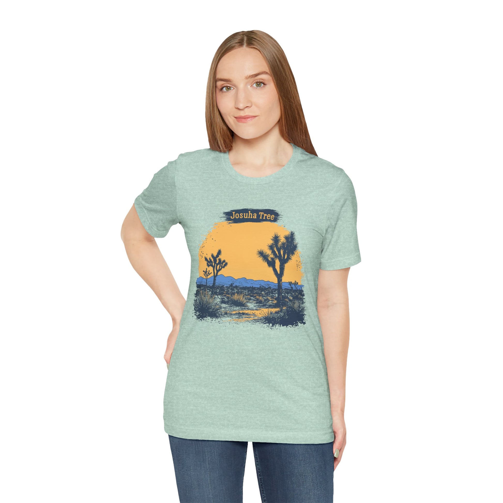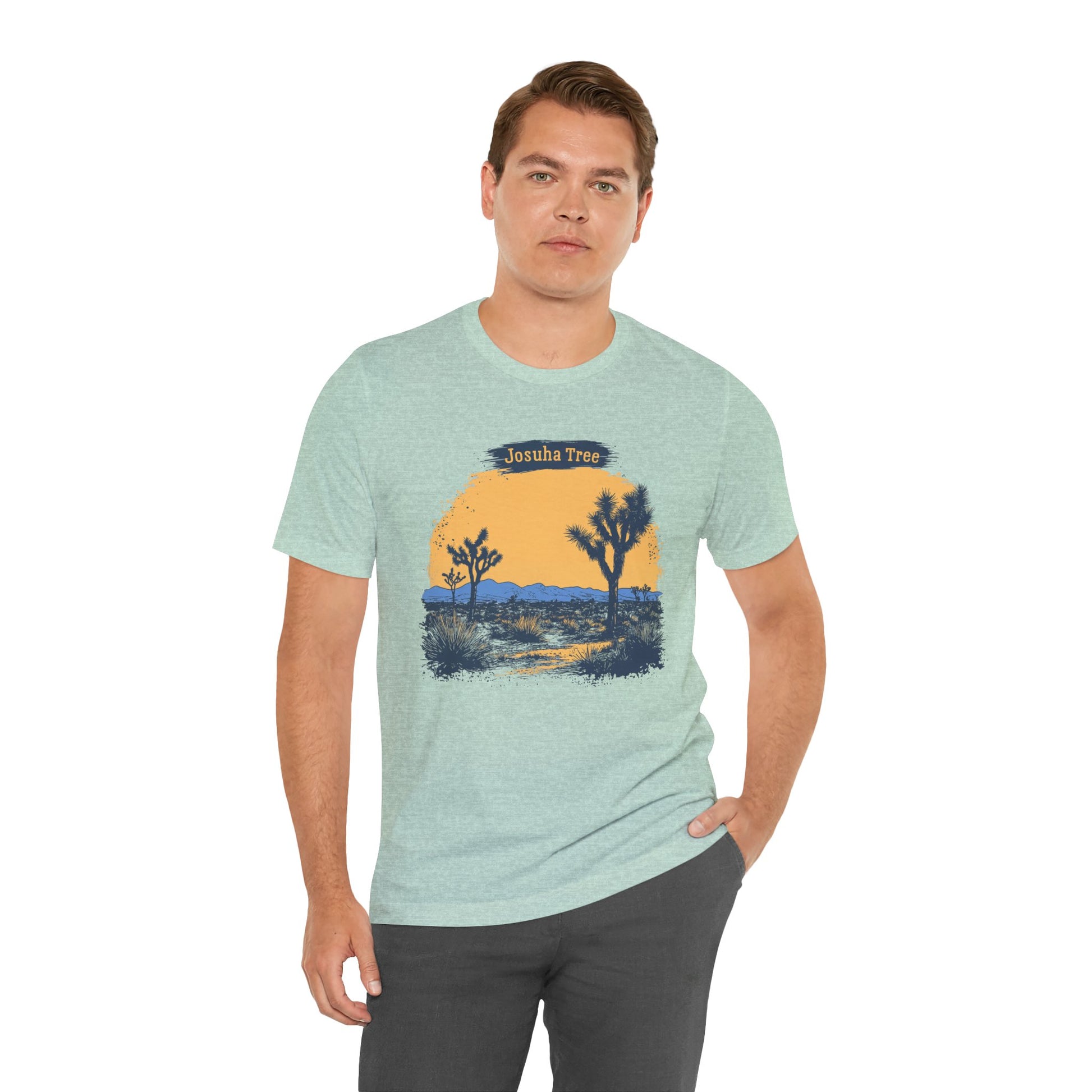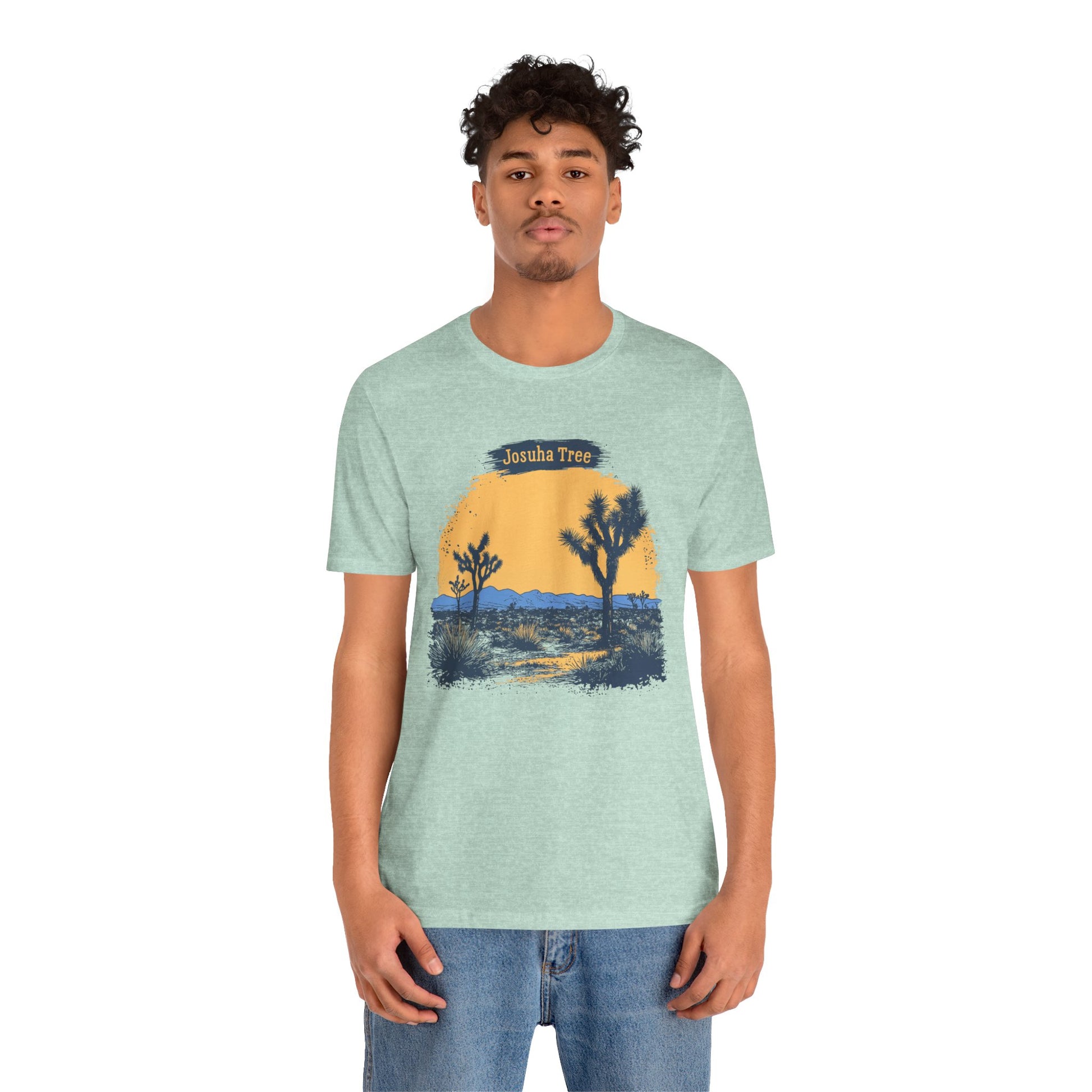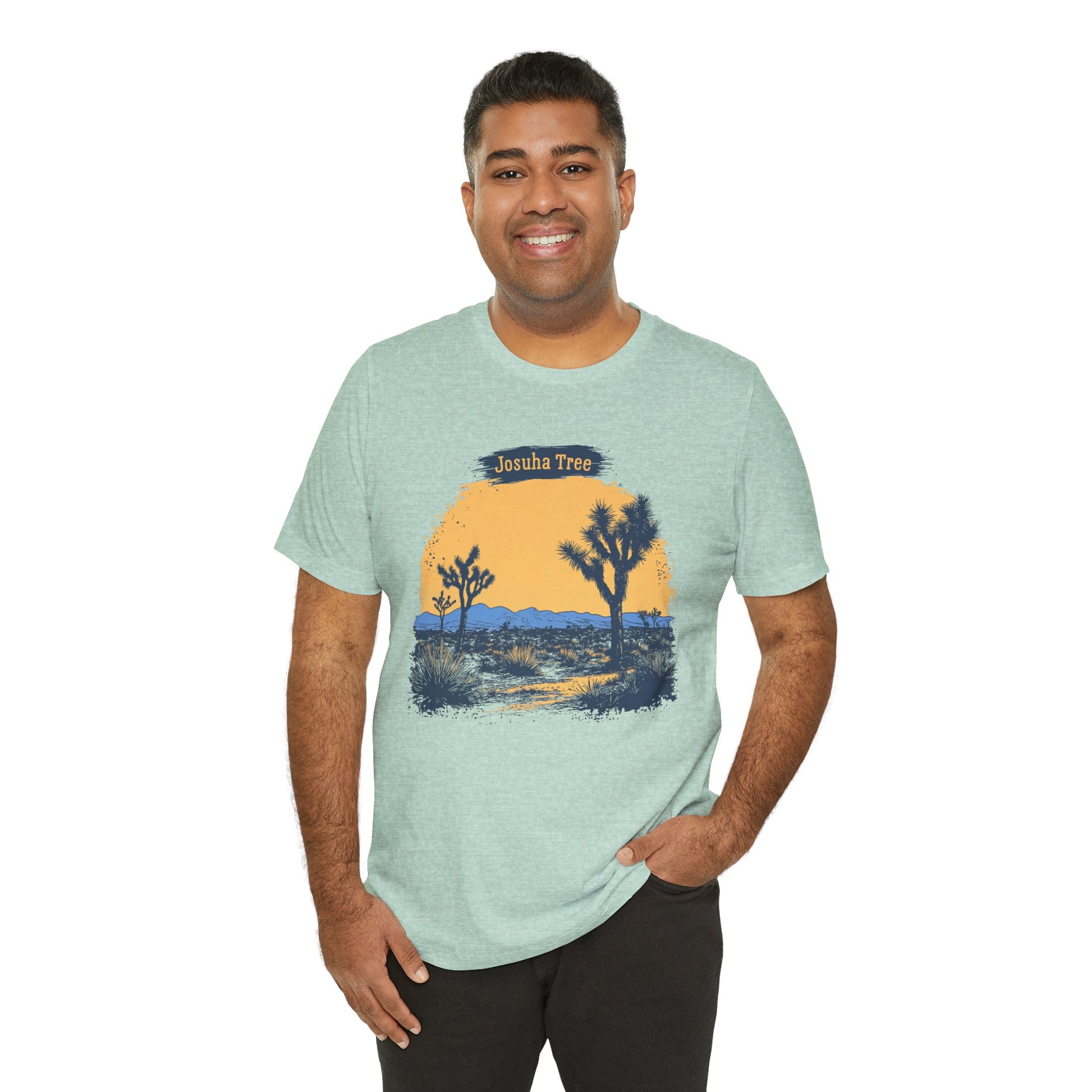 This T-Shirt features a graphic design of Joshua trees in the Yuca Valley with a sunset in the background.