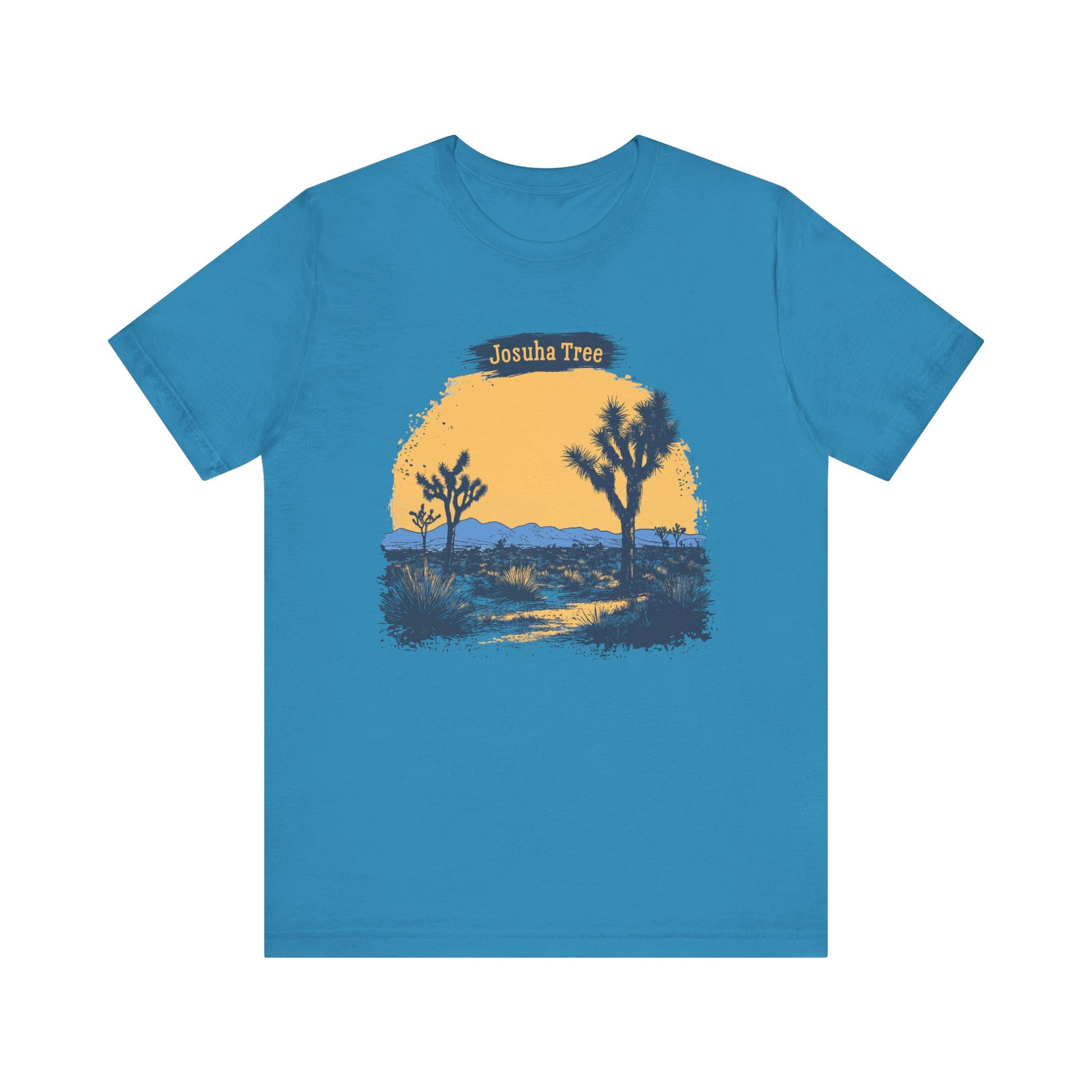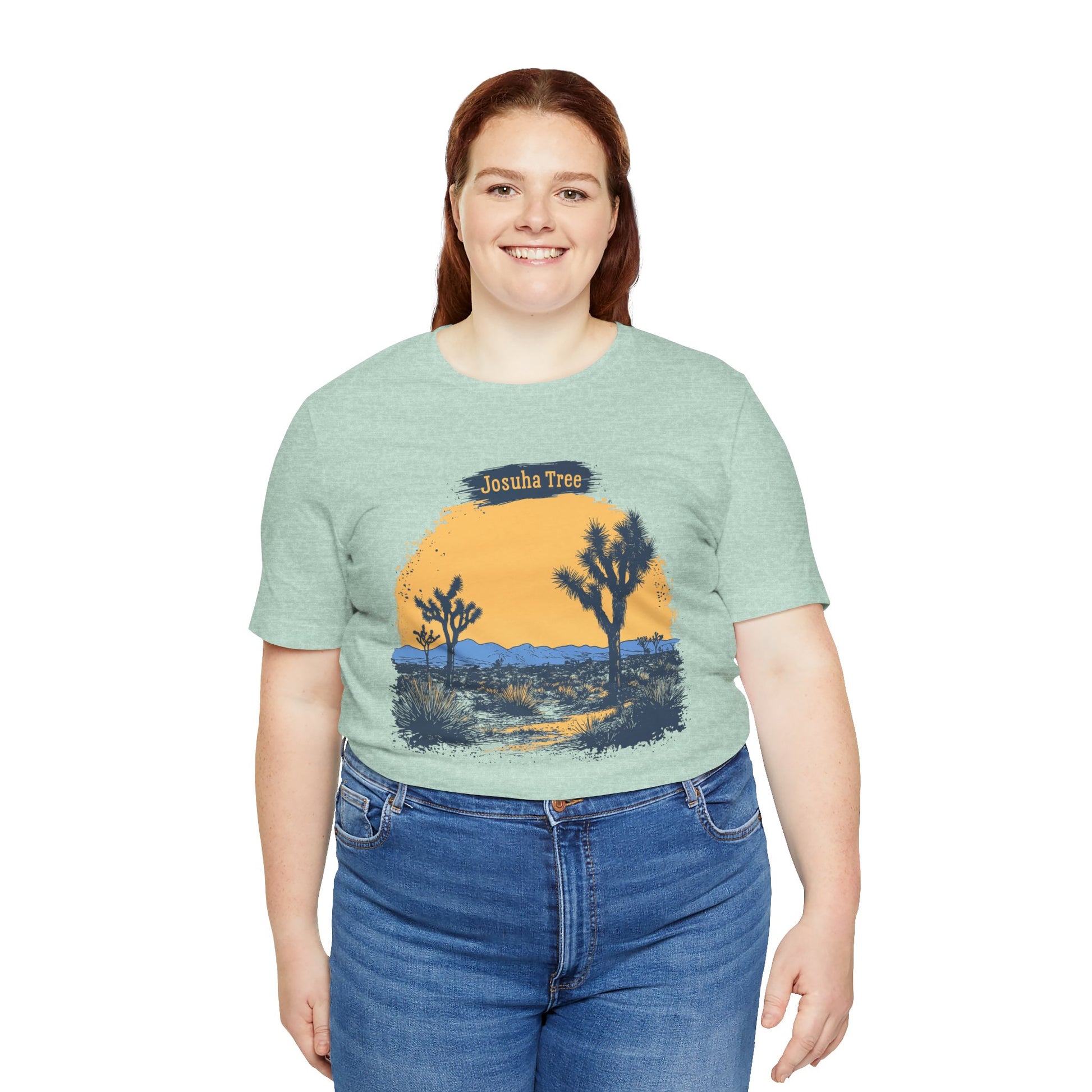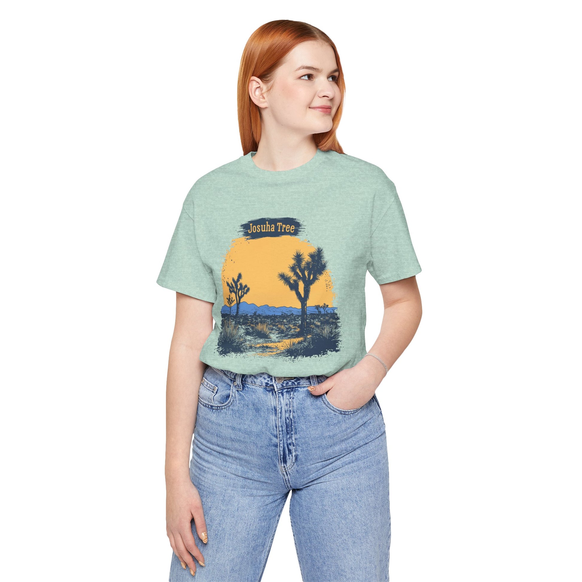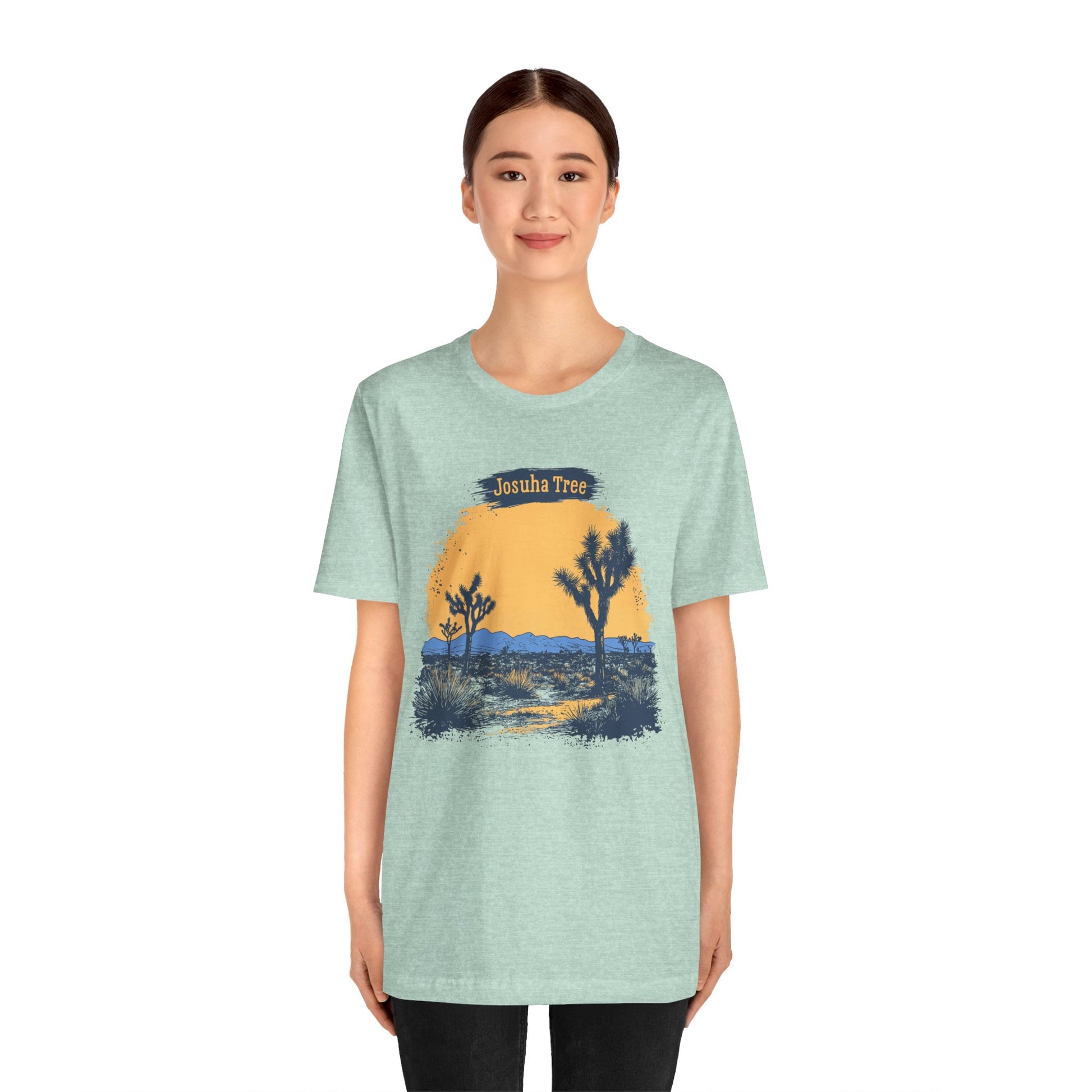 This T-Shirt features a graphic design of Joshua trees in the Yuca Valley with a sunset in the background.
